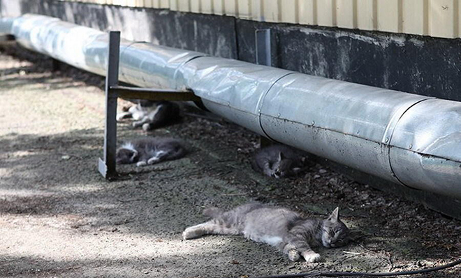 切尔诺贝利生存着大量的野猫,图中是在通风管道阴影处几只打盹的野猫。