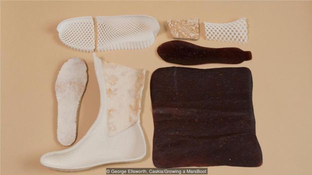 这次的委托让她认识了一种神奇的生物材料。这种材料已经引起了多方注意,包括从事建筑材料创新的工程师以及美国国家航空航天局(NASA)、欧洲航天局(ESA)这样的顶级航天机构。她的最终设计是一双外观粗糙的高桶女士长靴,可以在太空船上制作,原料几乎只需人类的汗液和一些真菌孢子,很适合随身携带物品非常受限的七个月火星之旅。
