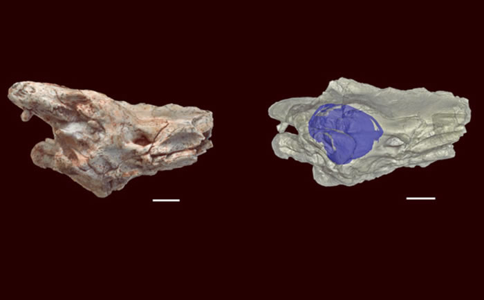 爱丁堡大学的Hongyu Yi博士和美国自然历史博物馆的Mark Norell通过计算机模型,揭开了这种古老生物头盖骨内隐藏的结构。随后他们将化石的CT扫描结果与现代爬行动物的扫描结果进行了对比。