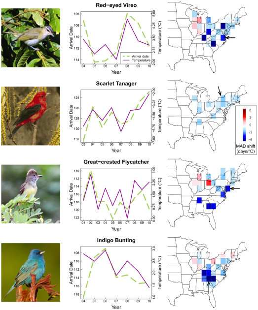 -鸟类改变了它们迁徙的抵达时间。地球温度每上升一度,鸟类平均就会提早八天抵达它们的目的地。有些其他物种则会提早三至六天。