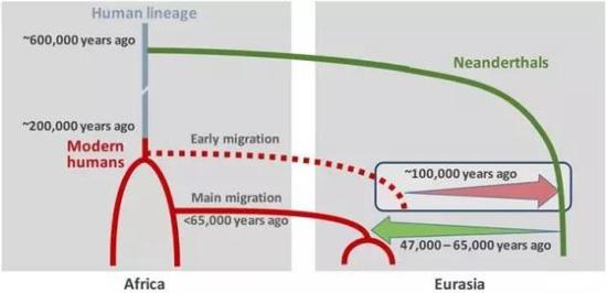 ?帕博与合作者的研究发现,尼安德特人与非洲以外的现代人类大约在4.7万-6.5万年前发生过混血(绿色箭头),而尼安德特人身上含有现代人类DNA可能是两个人群在大约10万年前相遇的结果(红色箭头)。 来源:马普协会莱比锡演化人类学研究所官网