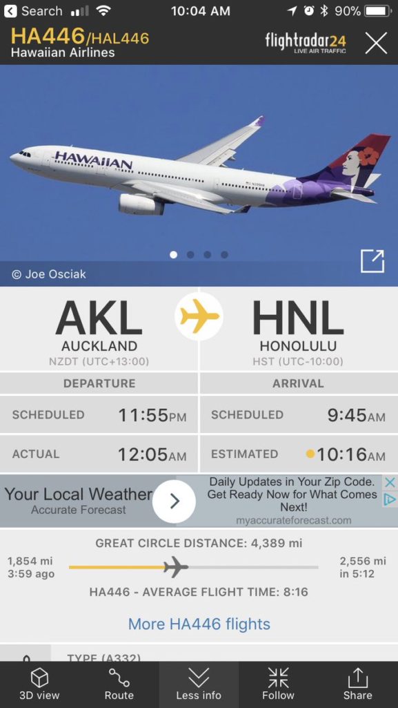 日前一架客机“从未来回到过去了”!夏威夷航空一架飞往檀香山的HAL446航班,本应在当地时间2017年12月31日11时15分从新西兰奥克兰起飞的,可是由于意外延误了10分钟,它最终在2018年1月1日零时5分出发。