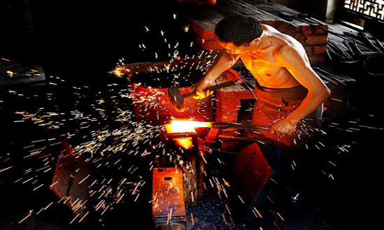于是,莫邪就剪下自己的头发、指甲,扔进火炉里,又叫三百童男童女鼓风装炭,待到炭火最为猛烈之时,莫邪便爬上炉台,“扑”的投身于火炉之中,自焚了。顷刻间,金铁融化了,变成液体的铁水,遂铸成了两把宝剑。