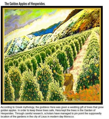 据希腊神话传说记载,天后赫拉曾收到大地之母的金苹果园作为结婚礼物,为了确保这片园林的安全,赫拉把它放在了赫斯帕里得斯家的花园里。经考古学家考证,现代位于摩洛哥索斯市的一处针叶林很可能是金苹果园的原型。