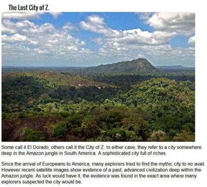 失落Z城是传说中亚马逊雨林里一个富有的古城,又称黄金国,始于一个全身披满金粉的南美部落族长的故事。1969年,两名哥伦比亚农场工人在波哥大附近的一个洞穴中发现了一件纯金制成的古代遗物:一个木筏上站着九个人像,其中周围八个戴金饰,似乎是贵族和侍卫,中间一个高大的人像装饰异常豪华,无疑是国王本人。这似乎可以说是那个黄金国庆典中木筏的模型。但失落Z城是否真实存在,目前尚无定论。