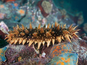 在美国南加利福尼亚海湾200米深的海底,生活着一种叫“巨型加利福尼亚海黄瓜(以下简称海黄瓜!”的棘皮动物,它是海胆和海星的亲戚。顾名思义,这种动物外形看起来像一条巨型黄瓜,有50厘米长,全身像黄瓜一样长满了疙瘩。它一头大,一头小。小的一端是头,大的一端是屁股。体内一条管子从头通到尾,是为消化道。海黄瓜是海底优秀的清道夫,它的头部长有触须,平时触须摊在海床上,像清洁车上的扫把一样把食物卷进嘴巴。