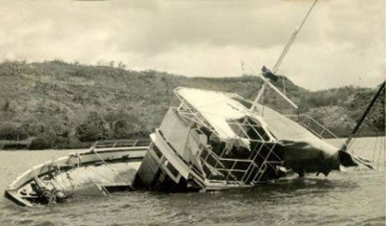 “乔伊塔”号也许是一艘“永不沉没”之船,但是它却对其他的危险无能为力。1955年,“乔伊塔”号连同船上的25名乘客和船员一起消失在南太平洋中。失踪了5周之后,它终于被人发现,船体就像我们在图中看到的那样倾斜着,半截浸泡在海水中。