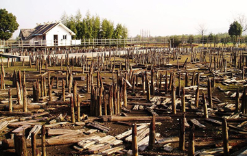 河姆渡是浙江省余姚县一个人口稀少的普通村庄。然而,1973年 6月.在这里竟意外发现了六干多年前种植的稻谷。而在此之前,学术界传统的说法是中国稻谷栽培技术来自于印度。同时,在出土的骨制品中,有一件器物上面还缠着葛藤.这正是河姆渡人的生产工具——骨耜(s)。骨耜的出土为河姆渡人种植稻谷找到了重要证据。