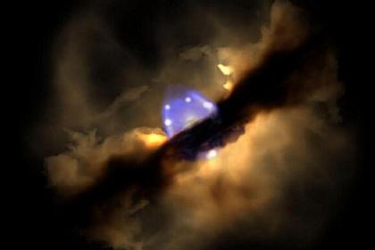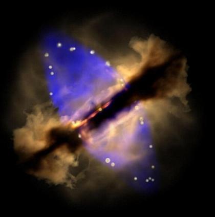 到了2014年,这项观测仍然处于进行之中,科学家发现紫色标记的物质从恒星两级释放,暗示这颗恒星正处于生长中