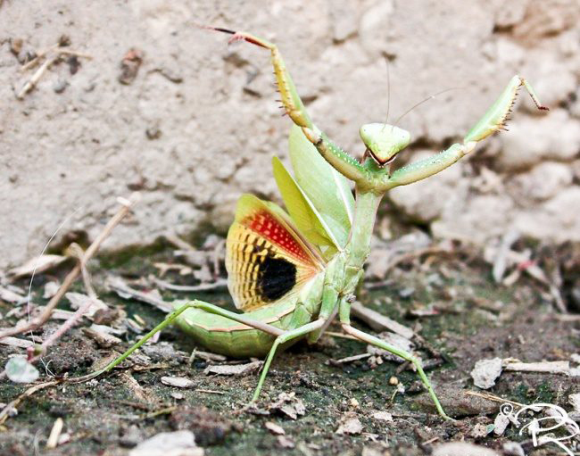 螳螂有5对眼睛,2对大的3对小的,在腹部上有一只耳朵,在两腿之间。