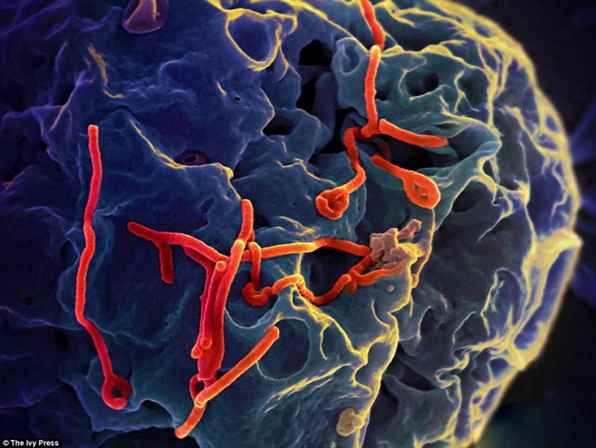 在这张电子扫描显微图像中,红色部分是埃博拉病毒,它们爬行在猴子肾脏细胞上,像细胞一样,病毒具有核糖核酸(RNA)或者DNA核酸,但没有构建蛋白质的物质。