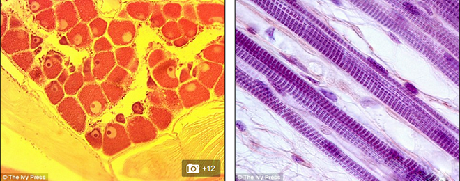 左图显示的是文昌鱼鱼鳃显微照片;右图是肌肉纤维。