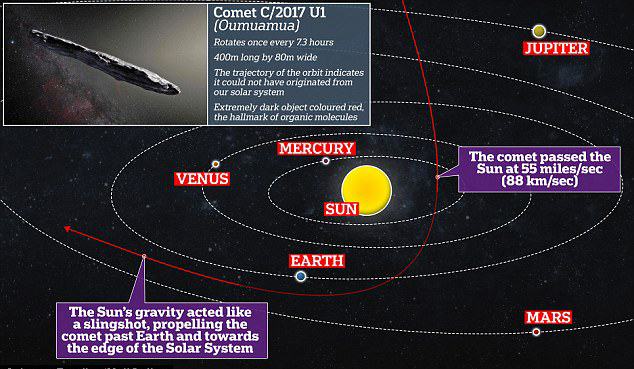 这个神秘的飞行物体被命名为奥陌陌Oumuamua,在夏威夷语中意为“远方的信使”。是人类首次在太阳系内发现系外天体。来自夏威夷大学的天文学家在十月份时首次发现了这个神秘飞行物。其长约400米、宽约40米,长度竟然是宽度的10倍,运行轨迹也不同。这不同寻常的大小使得科学对它是否是一个小行星再次思考。其颜色为红色,表面类似彗星或富含有机物质的小行星,其组成成分不清楚,但是没有水冰的迹象。