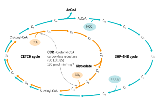 为了找到比RuBisCo表现更好的羧化酶,科学家们对所有已知的羧化酶系进行了生物化学和酶动力学检测。最终,他们将目光集中在了一类来源于α-变形菌及链霉菌体内的、烯酰辅酶A依赖的羧化/还原酶(ECRs)体系上。相比于RuBisCo,ECRs能够专一且高效的催化二氧化碳的固定,效率达到前者的2-4倍。经过进一步筛选,他们将ECRs中的巴豆酰-辅酶A羧化/还原酶(CCR)确定为人工固碳过程的第一个催化酶。而充当二氧化碳“接受者”的分子,则就是巴豆酰-辅酶A。