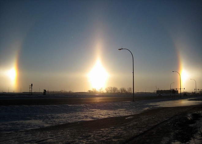看起来像有三个太阳的外星球,实际上是“幻日”的日晕效应,因阳光穿过悬浮在空中的冰晶反射而形成。