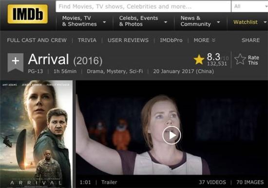 因此尽管一部分原著党并不买账,但电影《降临》自去年11月在美国上映之后,获得的口碑非常好,烂番茄新鲜度94%,在IMDb中,得分8.3分,而在豆瓣,7.8分的成绩也好于83%的科幻片和64%的剧情片。