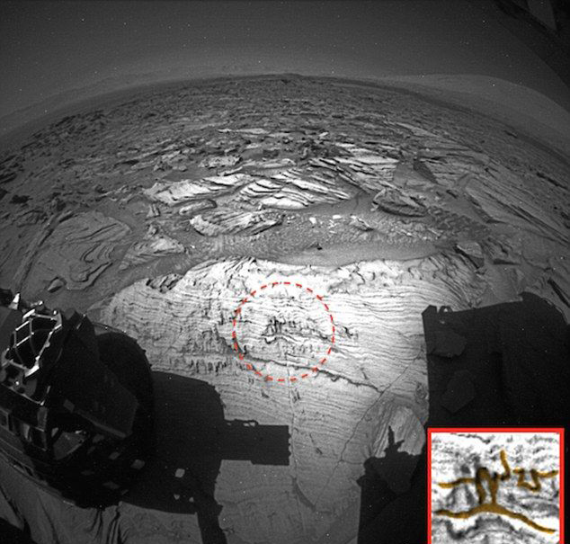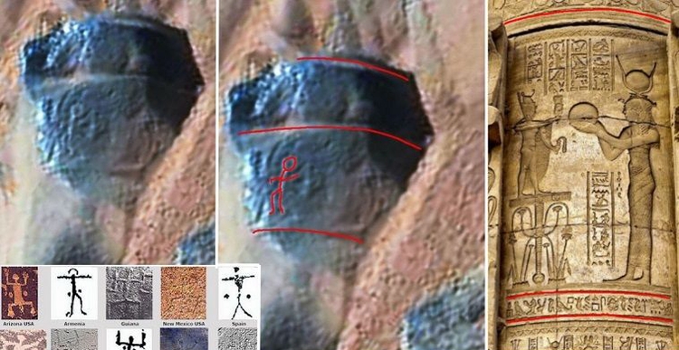 如今,幽浮迷Scott Waring最近的发现显示出,有更多证据支持此观点:远古时有生物住在火星上。根据Waring的说法,好奇号传回来的一个新影像显示,火星岩石上有异常的特征,它们非常像地球上的石刻画或雕刻。