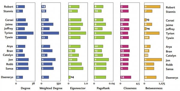 麦卡利斯特学院的数学副教授Andrew J. Beveridge和他的研究生Jie Shan使用了一套又被称为“网络学”的科学方法解析了马丁胖子的鸿篇巨制。它综合了图论,经济学,数学,社会学以及其他学科的知识绘制了一幅维斯特洛和厄索斯人物关系图。他们的论文发表在《Math Horizons》上,感兴趣的可以戳这里看原文。