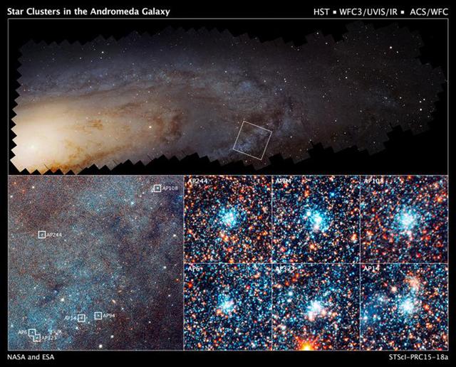 美国宇航局哈勃空间望远镜对银河系的近邻M31仙女座大星系进行了详细观测,拍摄了414张照片,揭示仙女座星系内许多疏散星团的细节。科学家发现这些星团跨度达到4400光年,形成了六个明亮的蓝色集群,每个集群跨度都达到150光年,这里是仙女座星系的恒星形成区。哈勃空间望远镜在新一轮的观测中记录下仙女座星系中2753个蓝色星团的位置,暗示这个星系内部充满了活力。