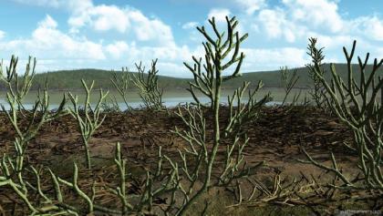 在泥盆纪崛起了具有“维管束”的陆生植物,包括乔木、蕨类植物、显花植物。越来越多的早期的非维管束植物,比如苔藓和地衣,在泥盆纪开始的时候就已经进化了。