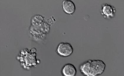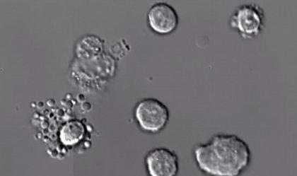 这项研究表明,单核细胞经历了细胞死亡的三个阶段,首先是膨胀,如图所示,图中左下方细胞出现膨胀。