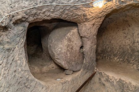 土耳其中部卡帕多细亚(Cappadocia)有一座庞大的地下城市。一名游客走过土耳其德林库尤地下城的一条通道。(Omar Haj Kadour/AFP via Getty Images)