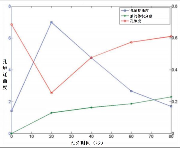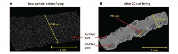 研究人员通过这项实验发现,土豆片炸得越久,孔的数量和面积就增加得越多,而这会帮助土豆片吸收更多的油。此外,土豆片炸得较久时,其孔道迂曲度便会减小,而这同样会帮助土豆吸收更多的油。