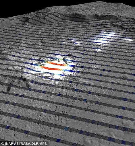 图中明亮的Occator撞击坑以增强色彩显示。Occator撞击坑是谷神星上最明亮的区域,人们一度认为它只是一大块亮度较高的地区。但探测器获取的数据显示,它的构成比我们想象的复杂得多。