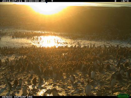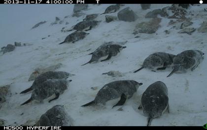 科学家们设置的远程相机一年之中进行着不间断的监视,这让科学家们有机会捕捉到那些很容易被错过的事件,比如在冬季的企鹅栖息地中出现了一些鞘嘴鸥的身影。这些食腐鸟类生活在企鹅群落中,但一般认为它们会在冬季迁徙到南美洲过冬,而不是留在南极。