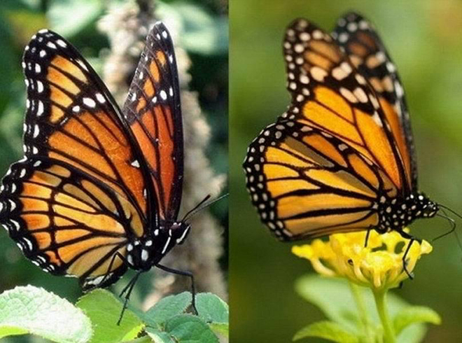 总督蝶和黑脉金斑蝶:当人们提及具有拟态模仿能力的昆虫时,会首先想到总督蝶和黑脉金斑蝶,它们的外貌形态非常接近,通常具有共同的掠食者,两者唯一的差别是总督蝶体型较小,黑脉金斑蝶的黑线一直延伸至翅膀下方。