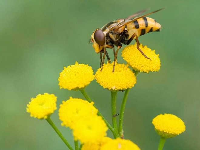 食蚜虻:自然界有许多种食蚜虻,并且差不多它们都不同程度地类似蜜蜂和黄蜂,其独特外貌的主要功能是避开掠食者,然而有时它们利用伪装特征伤害其它物种。图中是Volucella inanis,它们类似黄蜂的外貌特征便于将卵产在黄蜂巢窝中,最终食蚜虻幼虫会以黄蜂卵为食。
