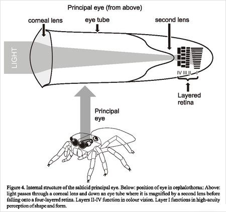 就像1609年著名天文学家首度使用的那台望远镜,基本上蜘蛛的眼睛是末端有镜片的管子。一个镜片收集并集中光线,另一个则使光线散开并放大影像,让蜘蛛能看到很多影像的细节。