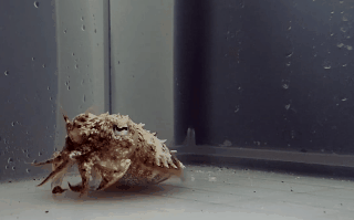有趣的是,当它们转变成这种“拟态模式”时,最上方两只触须还会持续举起,就像是寄居蟹的头一样;而最下方的触须更是会模仿“螃蟹脚走路”的样子,很难想像善于游泳的软件动物居然会直接用两脚走路,样子十分滑稽。