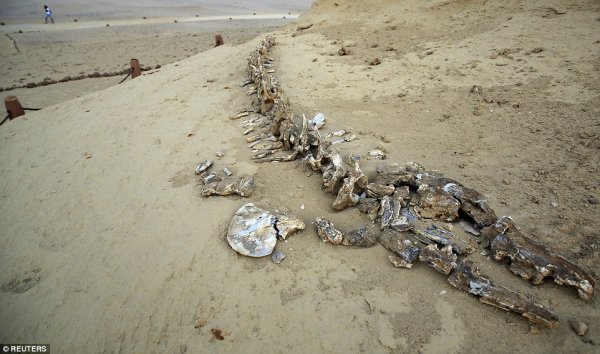 远古时代洋底的砂岩和石灰岩沉积现在已经变成了沙丘,千万年的风沙侵蚀使得保存在砂岩层的鲸鱼化石逐渐显露出来。科学家们发现了两种鲸鱼化石,一种是龙王鲸,长约20米,还有种是矛齿鲸,体型略小。