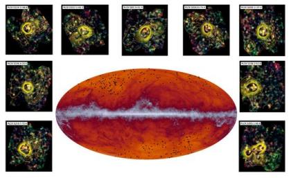普朗克卫星眼中的宇宙。中间的白带是银河,黑点是年轻星系团。周围的插图是星系团的放大图,黄色等高线表示密度。