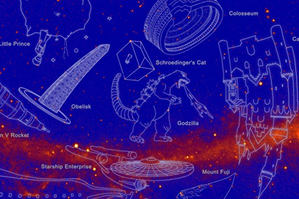 除了哥斯拉和浩克等电影角色之外,这些非正式星座也包括雷神之锤(Mjölnir,指索尔的武器),还有17世纪的瑞典沉船瓦萨号(Vasa),以及美国华盛顿纪念碑、法国艾菲尔铁塔、日本富士山等著名地标,甚至连费米伽玛射线太空望远镜本身也被列入。