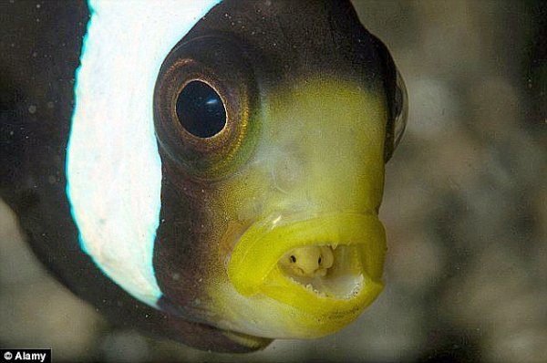 交配后母后颚鱼会把受精卵产在公鱼的洞里,公鱼用嘴收集起来,就这么一直含在嘴里,直到小鱼全部孵出来离开。