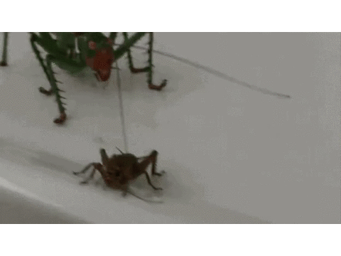 蝈蝈一般以素食为主,但这只蝈蝈显然是例外,它太贪食了。