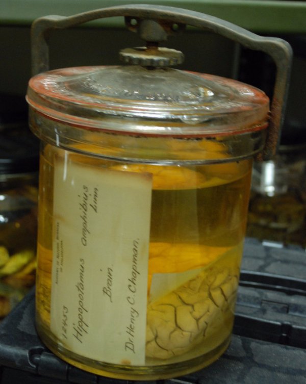 德雷塞尔大学的自然科学博物馆还有宝物,还有很多装在玻璃罐子里神奇标本,这是河马的大脑标本。“这可是一件老古董。”Ted Daeschler馆长说到。这件标本是1890年代费城动物园一位兽医的收藏。