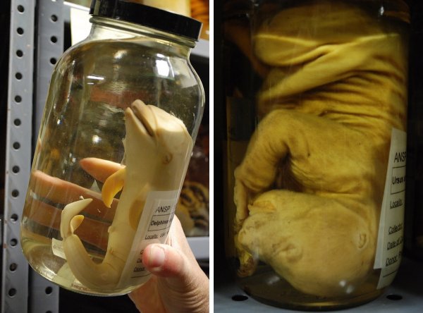 德雷塞尔大学的自然科学博物馆的馆长说他最钟爱两个标本,左侧的海豚胚胎和右侧的熊胚胎标本。这个海豚胚胎是来自上世纪40年代搁浅的海豚。而熊标本怎么来的他也不知道。