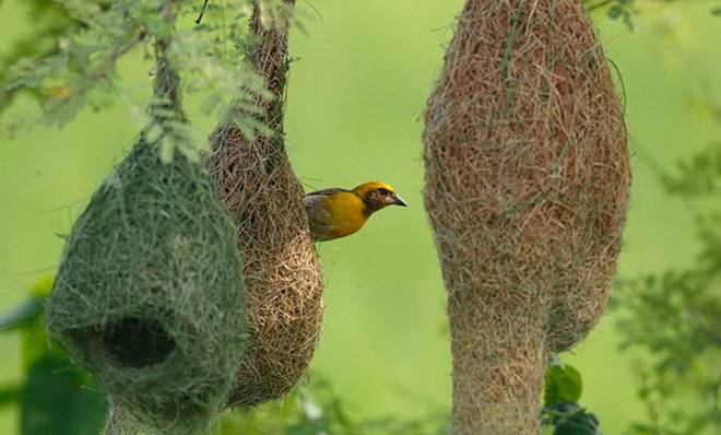 织巢鸟:虽然织巢鸟体型较小,但是它们非常勤勉,莉斯说:“这些体型微小的鸟类构筑复杂的‘社区巢窝’,使用草、细树枝和树叶纤维构成,一些社区巢窝能够容纳300多对鸟。”