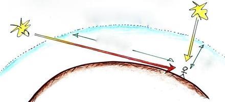 清晨,旭日东升,我们激动地看着它,但是其实,太阳根本不在那里,它还在地平线以下呢,而这就是大气层搞的鬼。原因当然还是光线折射的缘故,阳光通过大气层时,被大气层偏折了方向,阳光拐了个弯儿,射向我们的眼睛,让我们误以为太阳已经爬出了地平线。