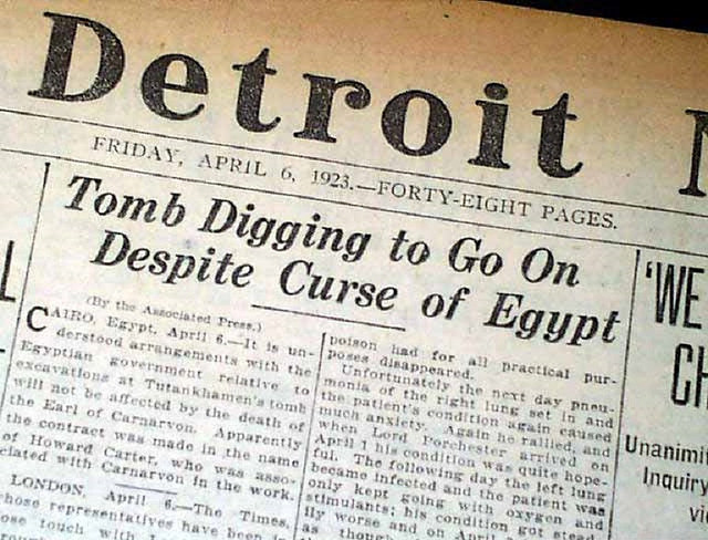 第一位“神秘的”死者是卡那封伯爵(Lord Carnarvon)。他被蚊子叮了,后来在刮胡子时割到蚊子叮咬的伤口。伤口感染了,导致败血症。Carnarvon死亡两周后,Marie Corelli写了一篇充满想象力的文章,发表于纽约世界报(New York World),她在文中引用一本不知名书籍的字句,它断定在外人闯入密封的陵墓后,“可怕的处罚”会随之而来。接着媒体开始跟风报道,说在法老的陵墓中发现了一个诅咒,但这不是事实。迷信的贝尼托墨索里尼(Benito Mussolini)曾收到一具埃及木乃伊,是别人送给他的礼物,得知这些说法后命人立即将它搬出基吉宫(Palazzo Chigi)。
