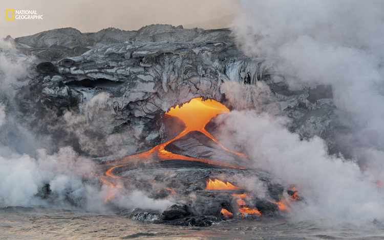 夏威夷是一个火山游乐场,它的熔岩流缓慢而曲折地流动在冻结的熔岩上,破碎成被称为“a’a”的壮观结构,或是渗出到细长绳状的“绳状熔岩层(pahoehoe)”。火山三角洲崩塌并落入海里,将“熔岩软管(lava hose)”释放到太平洋并引起蒸汽爆发。
