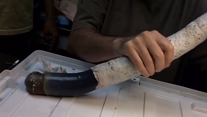 影片中,可以看到科学家小心翼翼地敲开活船蛆的碳酸钙管状硬壳,再把它倒出来,倒出来的瞬间,可以看到科学家相当兴奋啊~没想到它这么大一只!(虽然科学家们很开心,但其实小密看到都惊吓地说不出话了嘿嘿…)