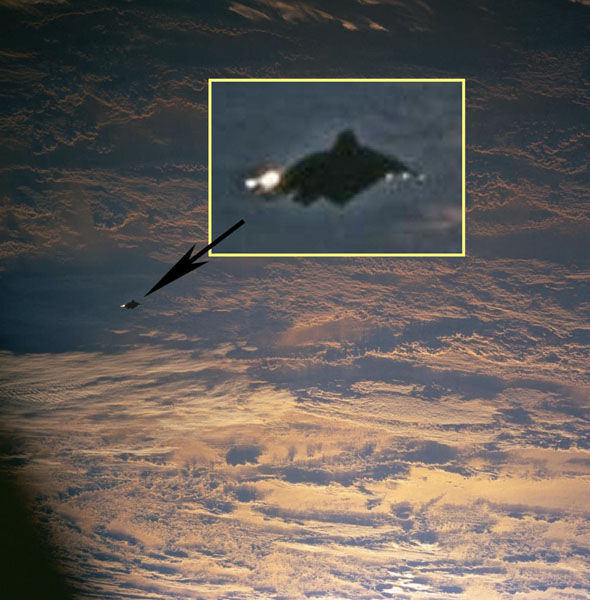 一位外星人爱好者宣称这幅影像,也许就是传说中的黑骑士卫星,掠过国际太空站(ISS)的画面。