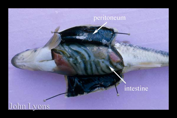 鲤科鱼类铜色突颌鱼肚子里的黑膜。图片来自:seagrant.wisc.edu