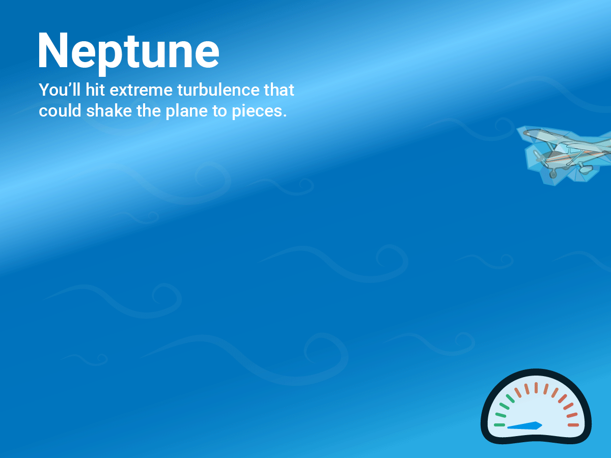在太阳系内,海王星的风速最快,高达1,500迈。如果你陷入海王星的疯狂风暴,那么空气湍流会将飞机震到破碎。此外,海王星的大气温度为-218摄氏度,飞机会同时冻结。