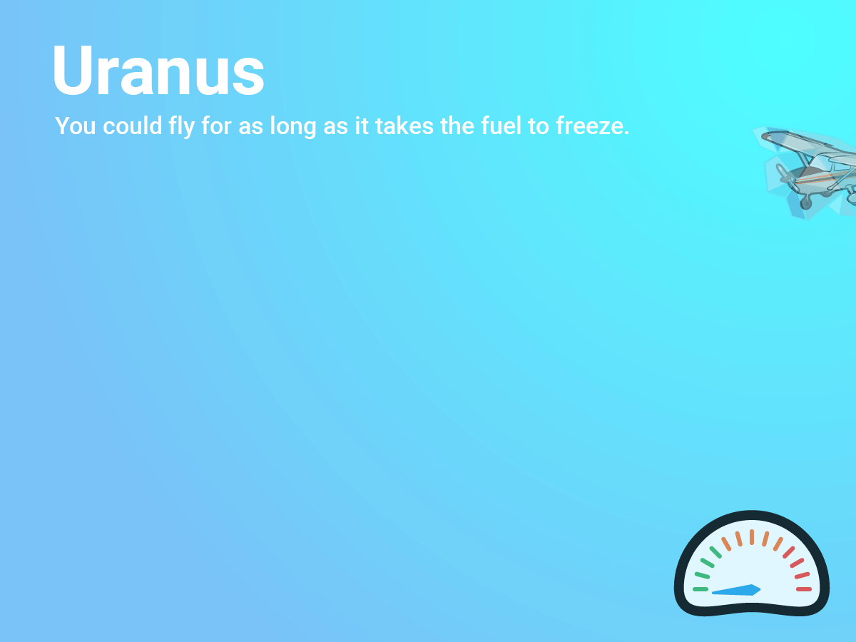 天王星十分黑暗、寒冷。在天王星上,你们的重量其实比在地球上轻。因此,你可以尽情飞翔,直到燃油在-212摄氏度的环境中冻成固态。