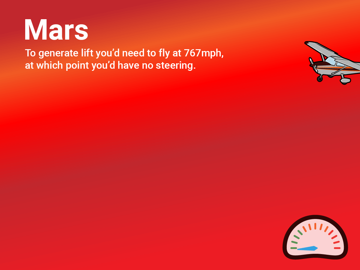 火星的大气比地球稀薄100倍。因此,飞机必须飞得非常快(约1马赫),才能在机翼上下方产生恰当的压力差,从而产生浮力。但在飞行过程中,速度之快将使你无法控制方向。
